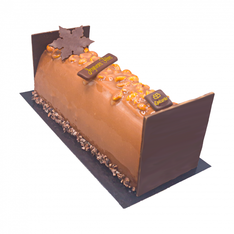 Croustillant streusel cacao, Biscuit chocolat grand cru, Caramel beurre salé, Mousse Mascarpone Pailleté, Mousse Gianduja et Noisettes.
