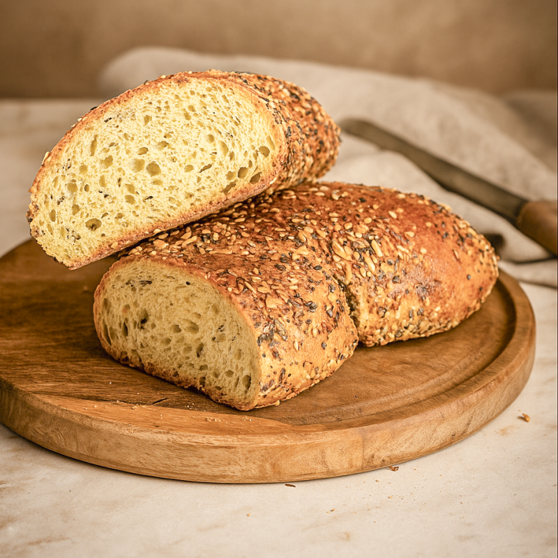 Mélange Subtil de Flocons de Blé et de Graines de Tournesol / Lin Brun, pour une croute Fine et Croustillante ainsi qu'une mie Grasse et Alvéolée.