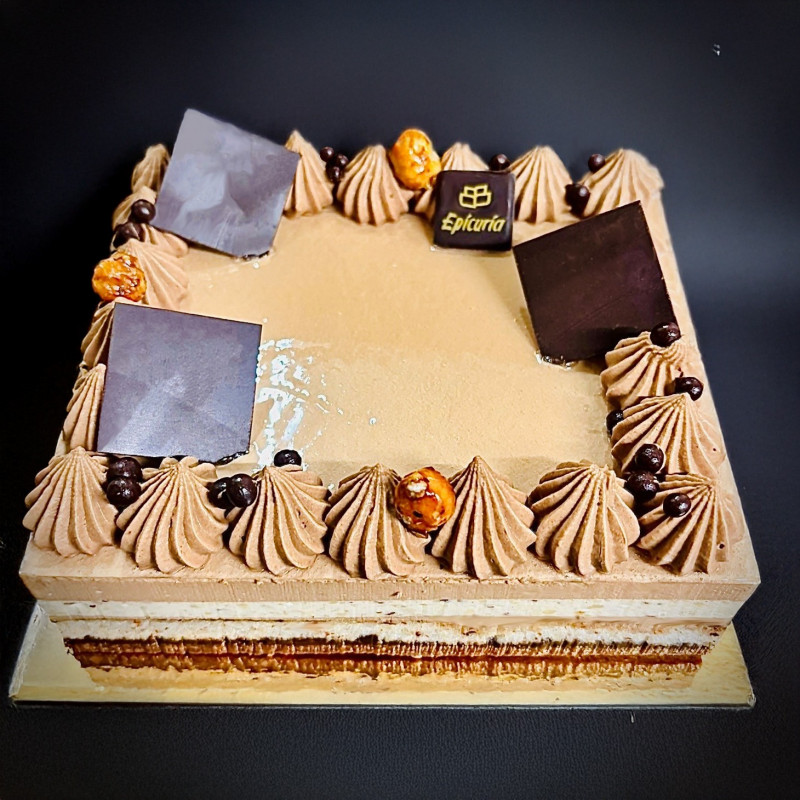 Croustillant Streusel Cacao, Biscuit Dacquoise aux Noisettes entières, Crème Bavaroise onctueuse Noisette et Praliné, Ganache Chocolat Noir (72%) et Mousse légère Chocolat au Lait.