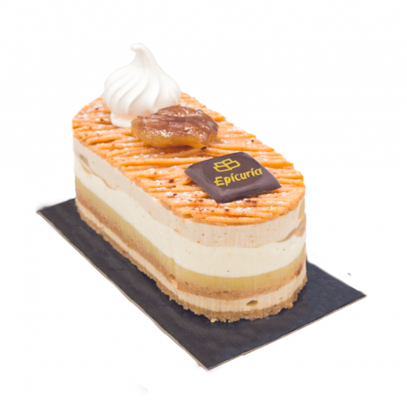 Biscuit Moelleux Aux Marrons, Mousse Mascarpone à la Vanille de Madagascar, Morceaux et Coulis de Poires, Mousse aux Marrons et Brisures de Marrons Confits.